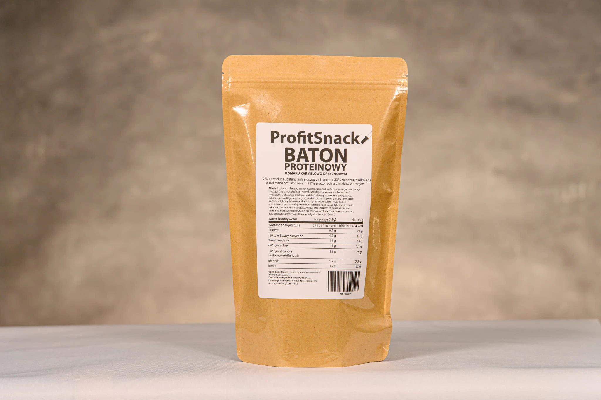 - 10 sztuk pełnowartościowych batonów proteinowych oblanych mleczną czekoladą z orzeszkami arachidowymi i nadzieniem karmelowym